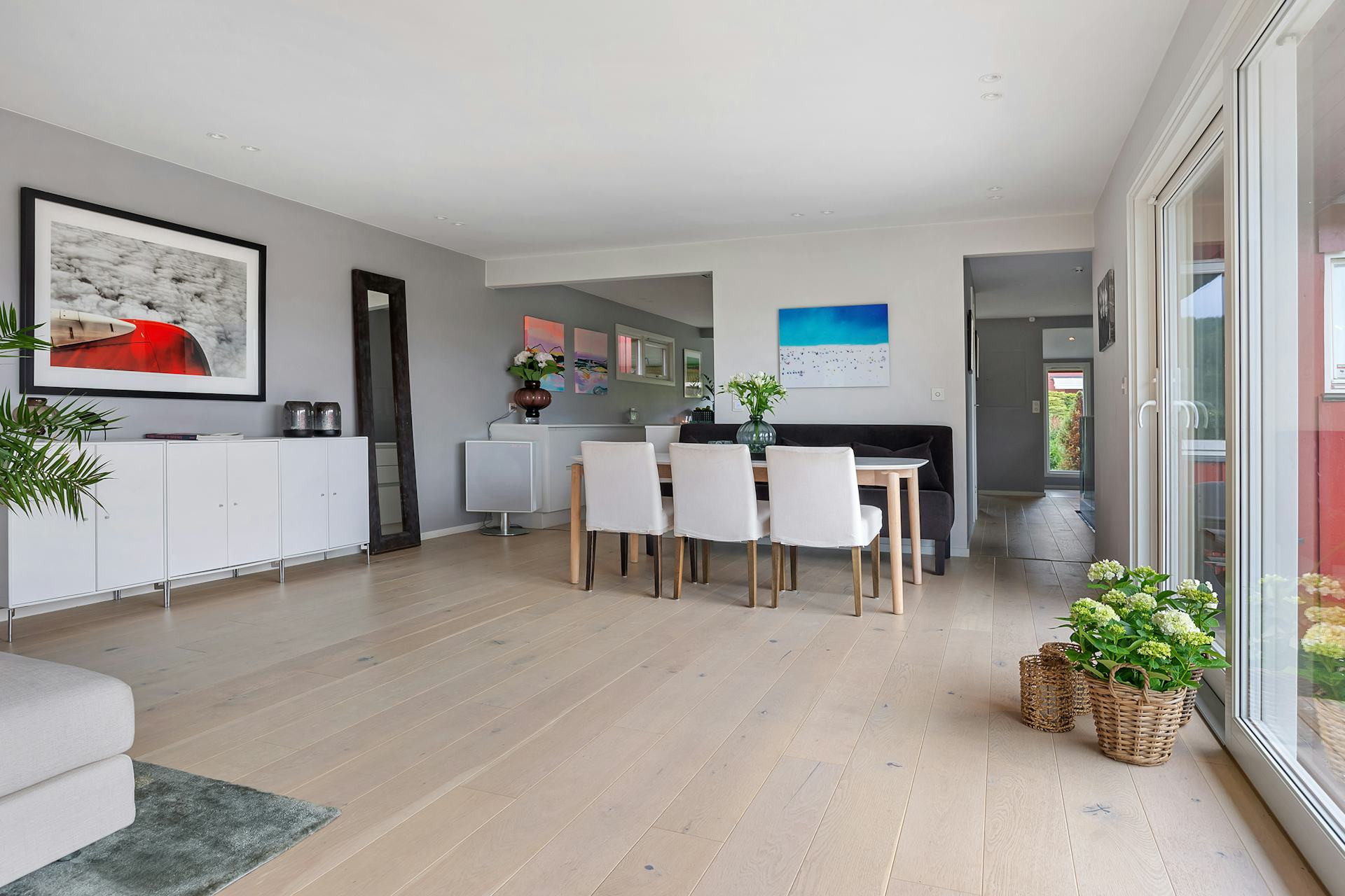 I större, öppna ytor kan du fundera på hur möbleringen ska vara. Har du till exempel ett långt kök–vardagsrum kan du låta brädorna följa rummets längdriktning för att skapa lugn och sammanhang. I mindre rum, som hall eller korridor, kan du använda läggningsriktningen för att leda blicken – till exempel mot vardagsrummet eller ut mot trädgården.